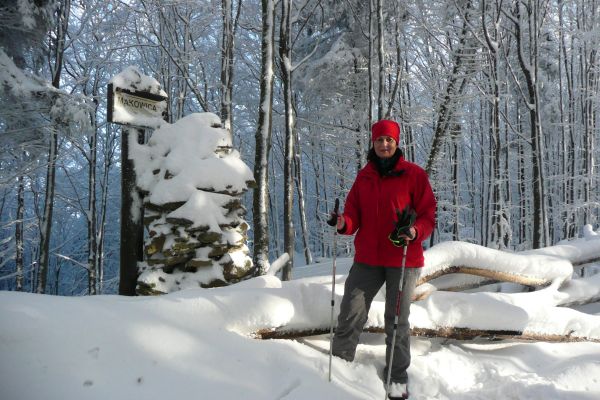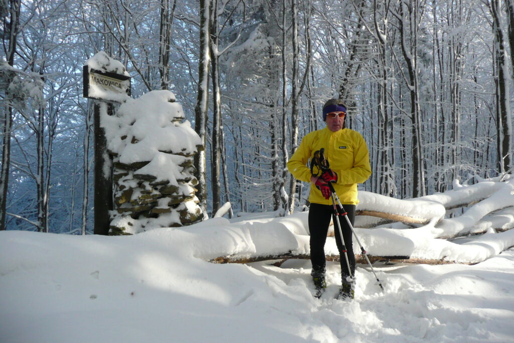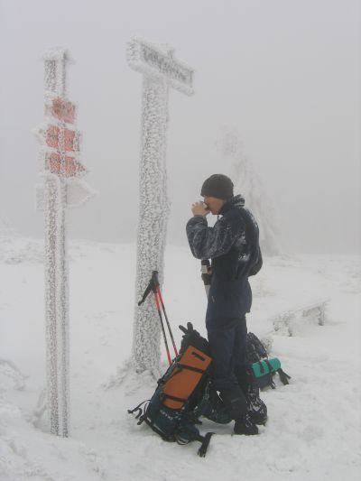 Wojtek. Dużo razem chodziliśmy. 194 cm wzrostu. O ile różnica między nami w lecie nie miała specjalnego znaczenia w zimie 18 cm to przepaść. Jak On miał śnieg do kolan ,ja mialem do połowy uda. I pewnej niedzieli ,w środku zimy wybraliśmy się na Niemcową – od Rytra. Od momentu podejścia śnieg powyżej kolan. Potężny wiatr powodował ,że było znacznie zimniej. Padał śnieg. Momentami kopałem się powyżej pasa. Wiatr tworzył zaspy. I tak z prostej, letniej trasy zrobiło się bardzo poważne ,ciężkie , zimowe podejście na granicy wydolności. Przynajmniej mojej. Wiekszość trasy prowadzil Wojtek ,ale przez to wcale nie było łatwiej, bo ja „wystawałem” ze śniegu znacznie mniej a i ślady były inne. To było jak to określają żeglarze „niedżwiedzie mięso”. Zdjęcie przedstawia pijącego Wojtka już na górze. Pod drogowskazem. Widać dokładnie jakie były warunki. Na trasie nie było nikogo. Z Wojtkiem przeszliśmy wiele górskich kilometrów ,jak również przejechaliśmy rowerami. Niestety w pewnym momencie rozdzieliło nas życie. Wojtek pojechał do Krakowa i znajomość się zakończyła.