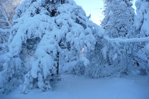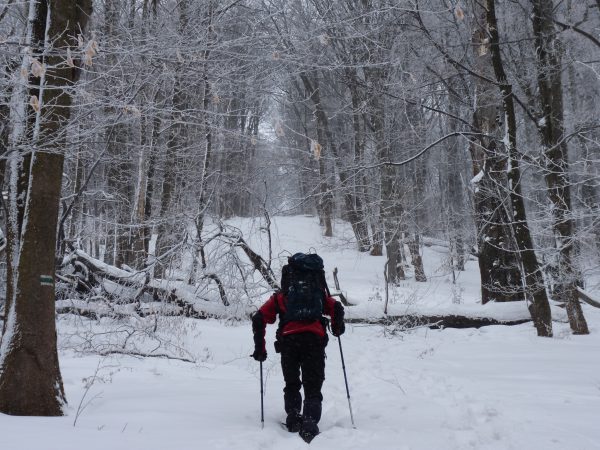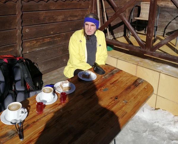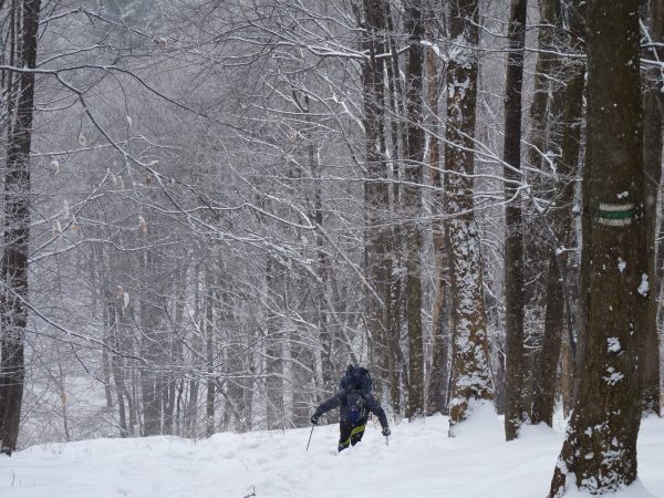 Zima 2017. Jeszcze mogłem wynieść 15 kg w tych warunkach. Oboje mieliśmy niezłą turystyczną formę. Przy zejściu nie znalazłem najkrótszej drogi na Cyrlę. Wszystkie „znaki” były zasypane. Kopaliśmy się straszliwie, ale w końcu dotarliśmy do szlaku i do schroniska.